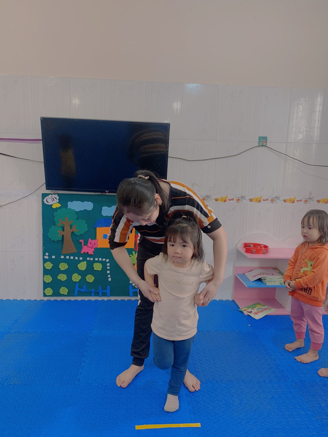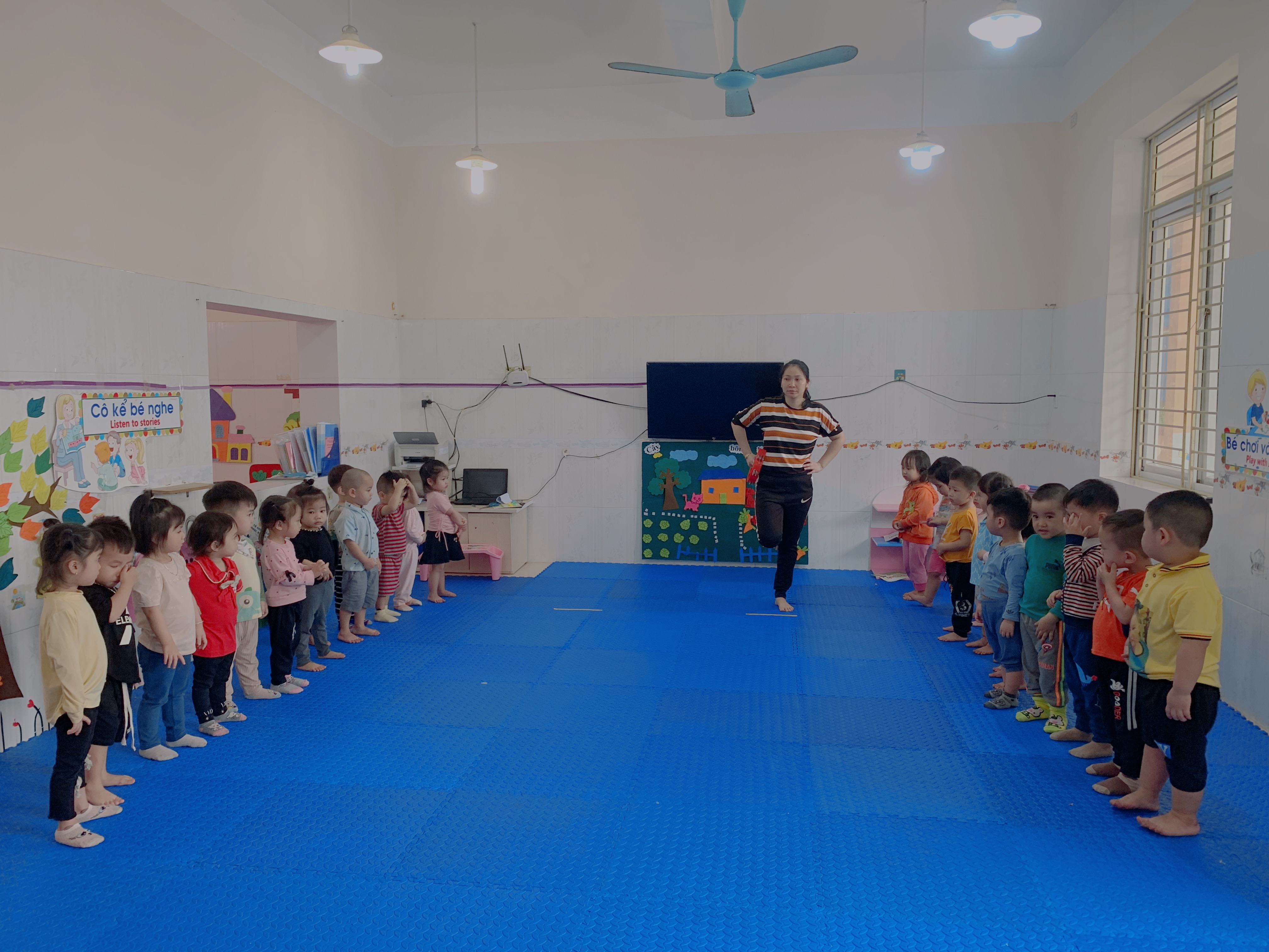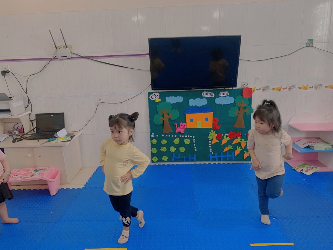 Chúng mình luyện tập vận động cơ bản: đứng co một chân với các bé nhà trẻ D2 nhé!